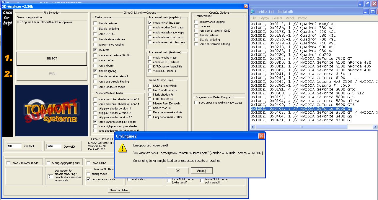 Zawsze mozna probowac 3dAnalyze v3.24 odpalic - ten soft dziala cuda :) (powoduje, ze nasza karta "udaje" inny model.